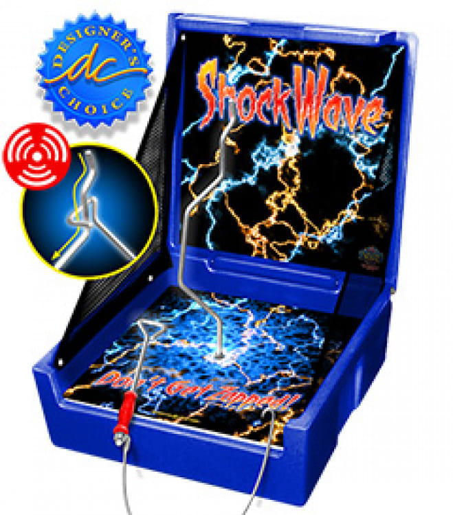 Maneuver the wand down the center rod without touching the sides in the Shock Wave carnival game. Be careful, or you might get zapped!